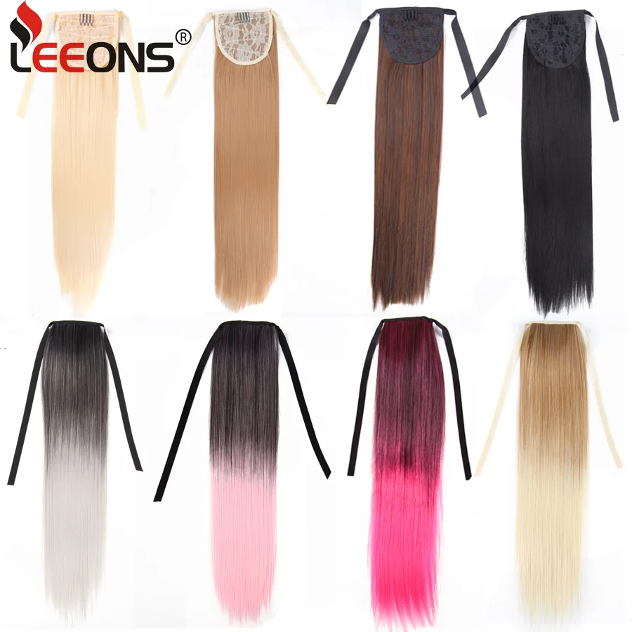 Leeons 20'' Synthetic Ponytail Hair pieces Heat Resistant Fiber Straight Ribbon Clip In Hair Extension 21 colors Brown Black